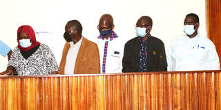 Maasai Mara University Vice Chancellor Prof Mary Walingo, Deputy Vice Chancellors Simon Kasaine ole Sano (Administration, Finance and Planning) and John Almadi Obere (Academic and Student Affairs), Finance Officer Anaclet Biket Okumu and driver Noor Hassan Abdi when they appeared before the court for the hearing of corruption case facing them on 14/11/2022