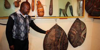 Francis Tallam, curator at the Koitalel Samoei Museum in Nandi-Hills town, Nandi County, shows traditional shields and artefacts.