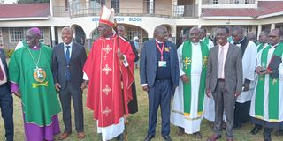Head of Anglican Church Archbishop Jackson Ole Sapit in red with businessman David Lang'at on his right and other church leaders when Dr Lang'at handed over his private school -- Dr David Lang'at Primary School -- to the church.