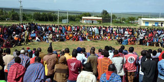 Naroosura Group Ranch members hold a meeting at Naroosura trading centre, Narok County, on April 2, 2018. They were discussing sub-division of the ranch. PHOTO | GEORGE SAYAGIE | NATION MEDIA GROUP