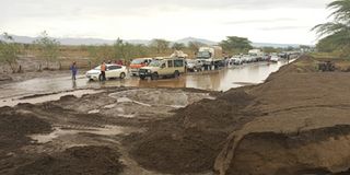 A section of Narok-Maai Mahiu road at Suswa area on March 26, 2023. The Road was blocked by debris swept down by flash floods. One person was killed by the floods on Monday.