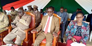 From Left: Uasin Gishu County Deputy Governor Daniel Chemno, Uasin Gishu County Commissioner Stephen Kihara and Uasin Gishu County Police Commander Ayub Ali, during this year's Madaraka Day celebrations held at Huruma Grounds in Eldoret town, Uasin Gishu County on June 01, 2022.
