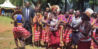 Baringo Governor Stanley Kiptis having a jig with Chepturu dancers from Tiaty during the Madaraka Day celebrations at Kabarnet Museum grounds on June 1, 2022
