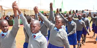 Pupils from Cornerstone AIC Academy in Eldoret town perfoming a play titled "Maintain Peace During and After the General Elections’ during this year's Madaraka Day celebrations at Huruma Grounds in Eldoret town, Uasin Gishu County on June 01, 2022.