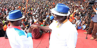 Nasa leaders Kalonzo Musyoka (left) and Raila Odinga prepare to address Lodwar, Turkana County, residents at Moi Stadium on July 27, 2017. Mr Odinga said many youth were not employed in Turkana and he would reverse that.