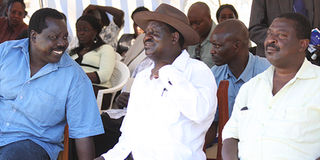 Prime Minister Raila Odinga (centre), Deputy Prime Minister Musalia Mudavadi (right) and nominated MP Musa Sirma during a fund-raiser in Talau Mixed Secondary School in West Pokot District on February 08, 2011. Mr Odinga said he is confident of capturing the presidency in next year’s polls.