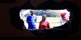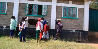 Parents inspect the damage on the wall of a classroom caused by a light aircraft that crash-landed at Guara Primary School in Nyeri County on September 1, 2023.