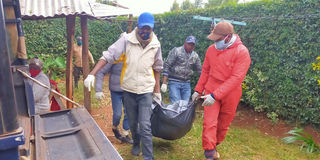 Residents of Kiamwathi in Nyeri on July 1, 2020 carry the body of a women suspected to have been murdered by a farmhand into a police van. PHOTO | NICHOLAS KOMU | NATION MEDIA GROUP