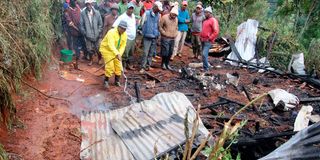 Residents of Mwenji village, Nyeri County, at the scene of a tragic house fire that claimed the lives of two siblings, aged six and two, on June 6, 2025.