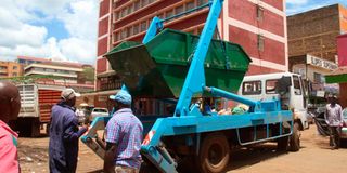 A skip bin for waste disposal is placed on a Nyeri street on October 22, 2019.