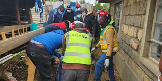 Homicide detectives and members of the public retrieve the body of Jane Wambui Njoroge, a clinical officer, from a shallow grave at her compound in Raini area, in Naivasha.