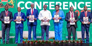 President William Ruto (centre) with Governors (from left) Stephen Sang (Nandi), Senate Speaker Amason Kingi, Ahmed Abdullahi (Wajir) Gladys Wanga (Homa Bay), Mutahi Kahiga (Nyeri) and PS Devolution Michael Lenasalon during the opening of the 2025 Devolution Conference in Homa Bay County.