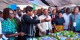 Homa Bay Governor Gladys Wanga (second left) showcases the Homa Bay envisioned city to Deputy President Kithure Kindiki during the official closing of the Devolution Conference 2025 at Homa Bay High School on August 15, 2025.