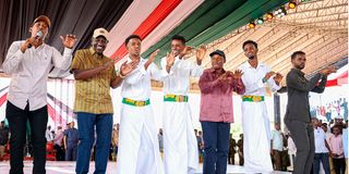 President William Ruto and his Deputy Kithure Kindiki during the Nyota Start-up Capital Disbursement at Garissa High School in Garissa County.
