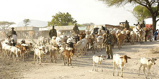 Armed police drive 400 head of cattle past Archer’s Post in Samburu East on March 5 during an operation to recover animals. Photo/ FILE