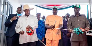 President William Ruto (centre), his Ugandan counterpart Yoweri Museveni (left) and the African Union Commission Chairperson candidate Raila Odinga (right) cut a ribbon to officially launch the 20,000-seater Jaramogi Oginga Odinga Stadium in Siaya county during the Piny Luo Festival on January 2, 2024.