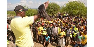 UDA chairperson Johnstone Muthama addresses voters in Lesesia area in Mahoo ward, Taita Taveta County. The ward's byelection will be held on Thursday.