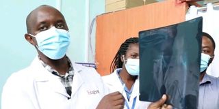 Orthopedic surgeon Dr Mustapha Masai reads a film of a patient who underwent a total hip replacement at Moi County Referral Hospital in Voi.
