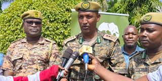 Tsavo Conservation Area (TCA) Assistant Director, Jillo Arero (centre) addresses journalists in Voi during a public participation forum held on Tuesday.