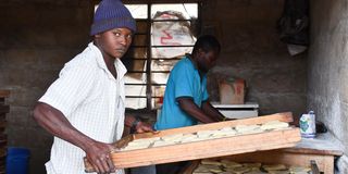 Mohammed Jarha arranging trays of dough ready for the oven at the Rimaya Bakery in Hola town.