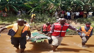 A team or rescue experts from the village and the Kenya Red Cross carry a body of a woman rescued from the river after a crocodile attack.