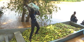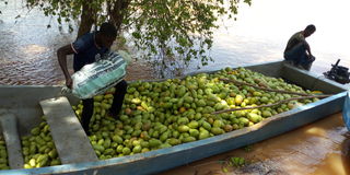 A group of boys offloading mango harvest from a boat at Vukoni village in Tana River County.