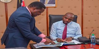 Tharaka-Nithi Governor Muthomi Njuki explains a point to Transport and Infrastructure Cabinet Secretary Kipchumba Murkomen in Nairobi on March 13, 2023.