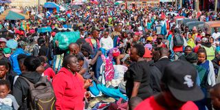 Traders and passers-by throng Gikomba Market, Nairobi, on December 21, 2025, in a surge of last-minute Christmas shopping, as Kenyans stock up on essentials before joining the seasonal exodus of travellers heading upcountry to mark the festive season with their families.