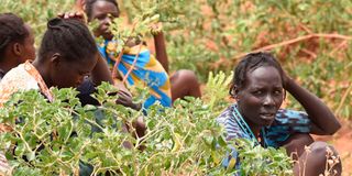 Women and children spotted at Sinoni in Mochongoi, Baringo County on February 16, 2023, take a break as they returned to their homes at Seretion village, from Romulel village, 10 kilometres apart, where they normally spend the night in fear of being attacked by bandits armed with guns at night.