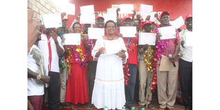 Former Petroleum Cabinet Secretary John Munyes- the Jubilee Party gubernatorial candidate for the Turkana seat and other party candidates eyeing various seats display their nomination certificates in Lodwar on Wednesday.