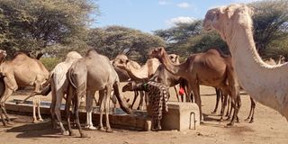 Camels quenching their thirst at the only functional borehole within Sopel village in Turkana County.