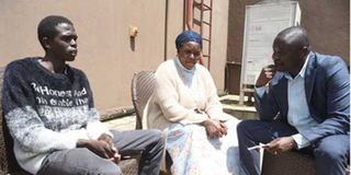Amon Kipruto (left), who claims he was paid Sh600,000 to have his kidney harvested, with his mother, Leah Jepkorir, and Nandi Hills MP Bernard Kitur during an interview on Friday.