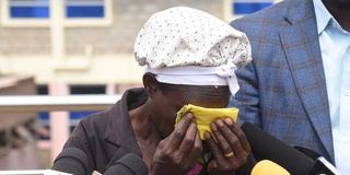 Sarah Jeruto, mother of Emmanuel Kipkosgei, one of the people who claim to have received money to have his kidney harvested, at Mediheal Group of Hospital in Eldoret City, Uasin Gishu County, cries during an interview at Boma Inn Hotel precincts.