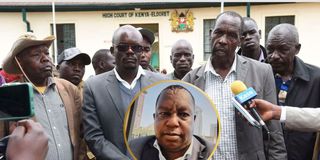 Richard Kiptoo (right), uncle of Bethwel Chesir, the missing personal assistant of Marakwet East MP Kangogo Bowen, accompanied by other family members and their lawyer Stephen Ombego (centre), at Eldoret High Court precincts in Uasin Gishu County on August 12, 2025, after filing an application to compel the State to produce him, dead or alive. (Inset) Bethwel Chesire.
