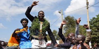 Marakwet East MP Kangogo Bowen celebrates with his supporters after his election was upheld by the Court of Appeal in Eldoret on July 12, 2018. File | Nation