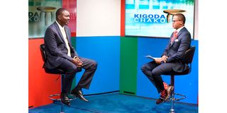 Uasin Gishu County Governor Jackson Mandago being interviewed by NTV news anchor Salim Swaleh on the Kigoda Chako show at the NTV Eldoret Studios on Monday April 04, 2022. Governor Mandago who is serving his second term is eyeing the Uasin Gishu Senate seat.