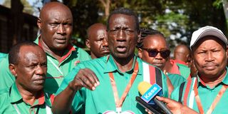 Knut Secretary-General Collins Oyuu (centre), accompanied by the union’s National Executive Committee members and officials, addresses the press during the Eldoret West Knut Branch’s Annual General Meeting held at Bishop Delany Memorial Secondary School on August 15, 2025.