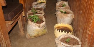 Marijuana planted by Cornelius Korir in flower vessels is displayed in an Eldoret court on March 19, 2025.