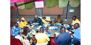 Aspirants for the Uasin Gishu County gubernatorial seat eyeing the UDA ticket during a breakfast meeting at Queens Garden Hotel in Eldoret town on April 12, 2022. They promised to accept the people’s verdict in the party nominations slated for April 14, and called on their supporters to uphold peace during and after the exercise.