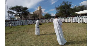 Followers of Dini ya Roho Mafuta Pole Afrika at the church's New Jerusalem headquarters at Tamugh, Sook hills in West Pokot county.