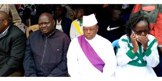 Former West Pokot Governor Simon Kachapin (center) with West Pokot Woman Representative Lillian Tomitom and religious leaders of Dini ya Roho Mafuta Pole Afrika at Keringet area in West Pokot county on Sunday April 24, 2022.