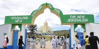 Followers of the Dini ya Roho Mafuta Pole Ya Afrika sect enter the church through the different entrances for men and women at its headquarters in Sook village, West Pokot County, on February 18. Inset.