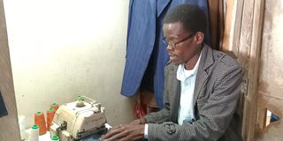 Joseph Omondi Oyomo who is a tailor at Elegance Textiles in Kapenguria, West Pokot.