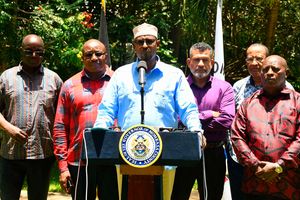 Council of Governors Chairman and Wajir Governor Ahmed Abdullahi (centre) with fellow governors during a press briefing in Nairobi on September 1, 2025.