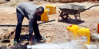 A man fetches fresh water that was flowing after the main pipe was damaged near Awanad CFS along the Mombasa-Nairobi highway in this picture taken on 1 April 2019.