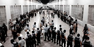 Salvadoran police officers escort alleged members of the Venezuelan gang Tren de Aragua recently deported by the US government to be imprisoned in the Terrorism Confinement Center prison.