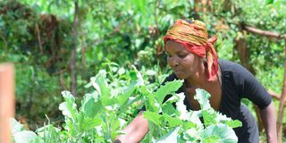 Agnes Barasa, a farmer from Maeni ward, Bungoma County, tending to her crops. She uses compost manure, liquid fertiliser and plant-based pesticide to improve soil health, therefore boosting food production.