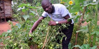 Jack Wafula displays tomatoes nourished using liquid fertiliser.