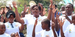 Homa Bay Governor Gladys Wanga takes part in an exercise before a mock run at Ruma National Park on July 11,2025 ahead of the road antelope half marathon next month.