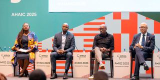 From right, Dr Chikwe Ihekweazu, acting WHO Regional Director for Africa, Dr Githinji Gitahi, group CEO, Amref Health Africa, Dr Sabin Nsanzimana, Minister of Health, Rwanda and Dr Claudia Shilumani, director of External Relations and Strategic Management at Africa CDC, speaking at AHAIC 2025 in Kigali, Rwanda.